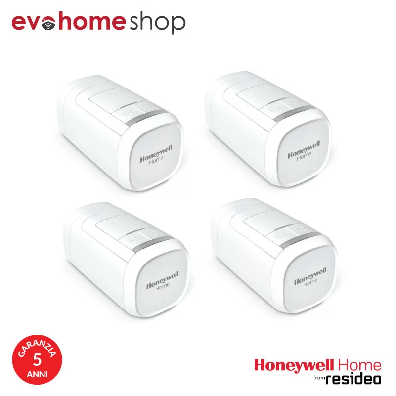 Kit da 4 testine termostatiche elettroniche da radiatore collegabili al sistema evohome in radiofrequenza per la regolazione della temperatura.