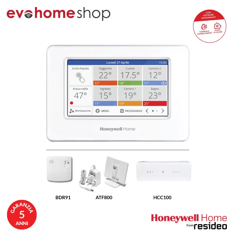 Al Kit vanno aggiunti i Termostati Honeywell Home from Resideo di questa categoria, tanti quante le zone in cui sarà diviso l'impianto.