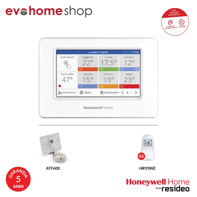 Il Kit 4 zone per impianti centralizzati Evohome è un sistema di termoregolazione a zone wifi programmabile. Il kit da noi proposto comprende un pannello touchscreen a colori Evotouch Wi-Fi (gestione fino 12 zone), 4 testine termostatiche wireless HR93 con display orientabile retroilluminato e supporto da muro.